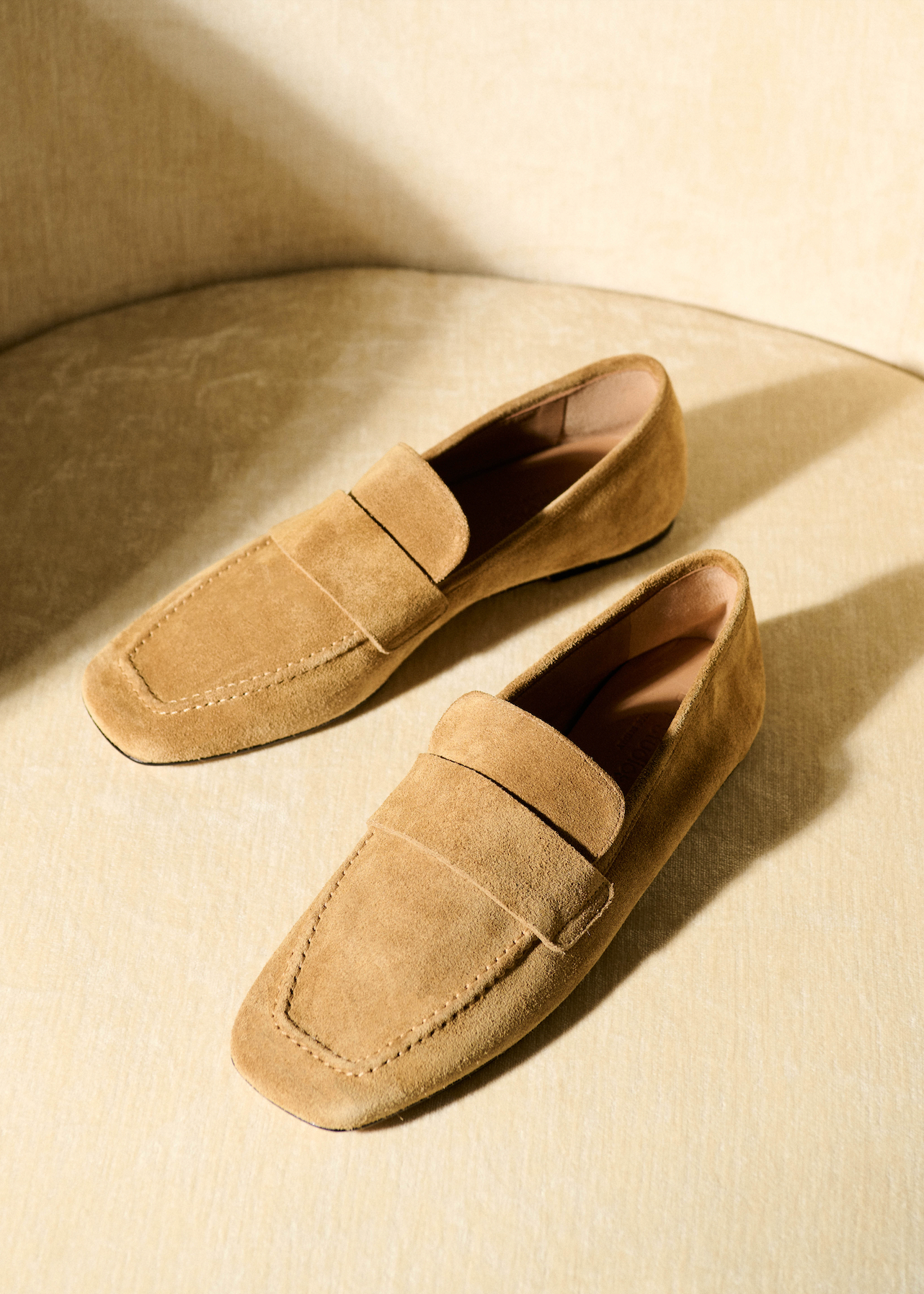 The classic Francesca loafer is crafted in a soft, classic tan suede. Francesca features a penny strap and rounded-square toe.