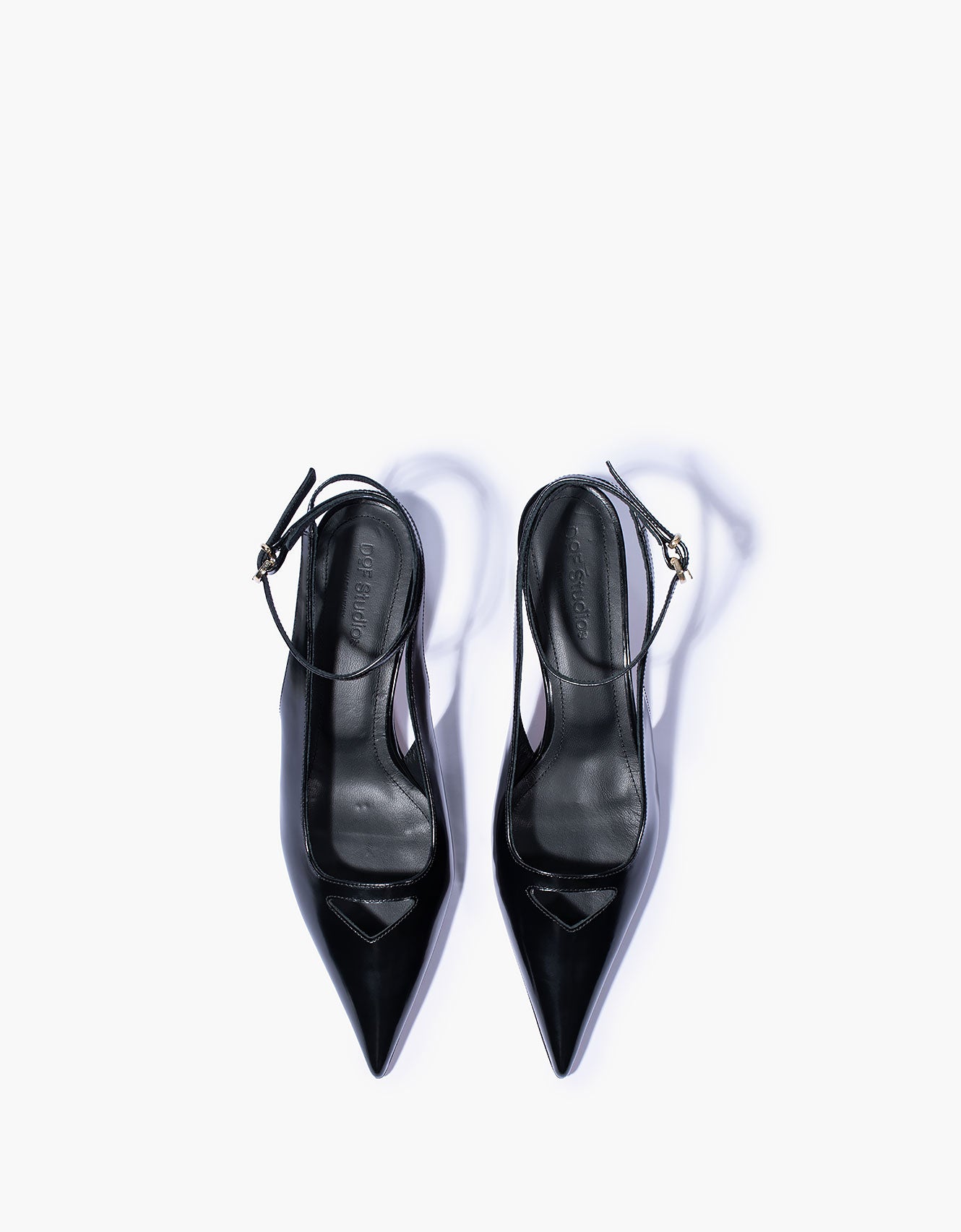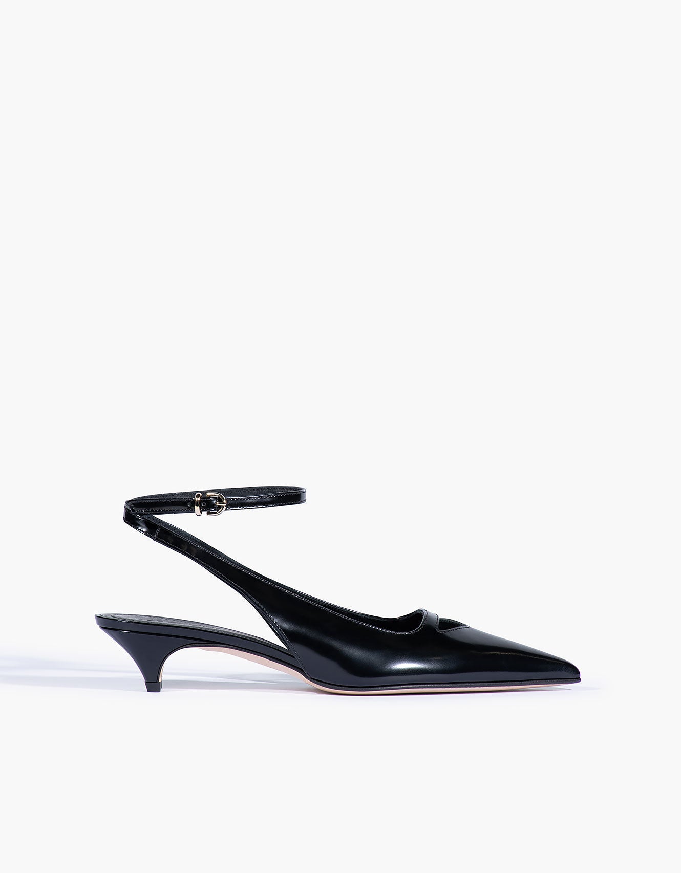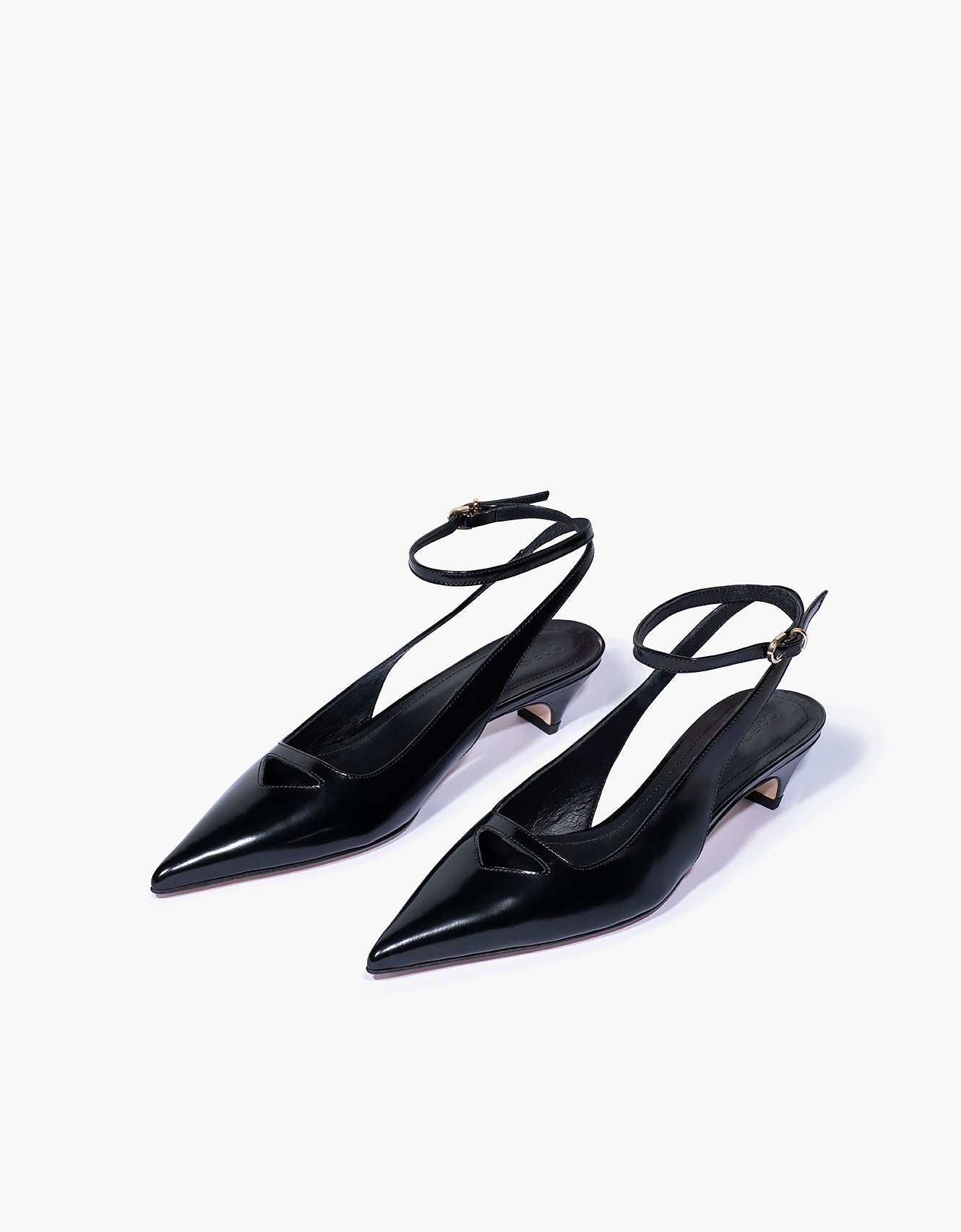 A study in restraint and elegance, the Jil Slingback Heel is crafted in high-shine leather with a sleek pointed toe and delicate ankle strap. The low, sculptural kitten heel offers ease without compromising sophistication. Made in Italy from LWG certified leathers.