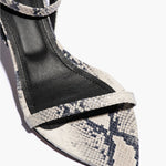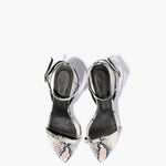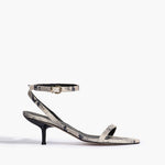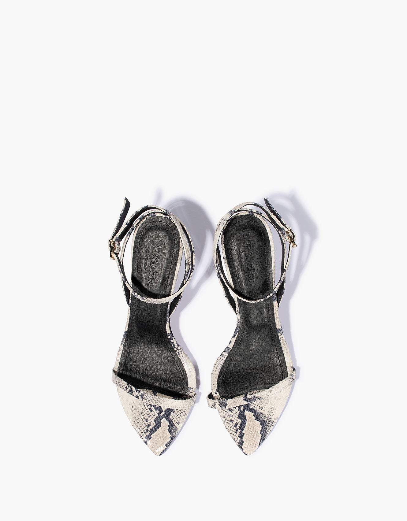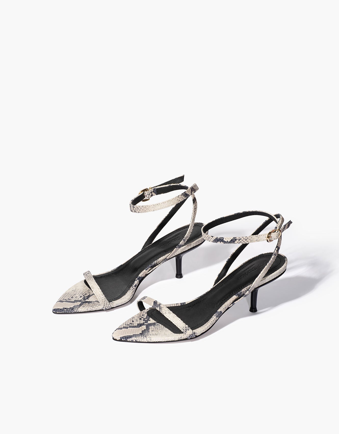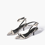 A sleek heel to complete any look this event season. Leona is simple yet sculptural, and features a wrap-around ankle strap, exaggerated pointed toe and a gold micro buckle closure.