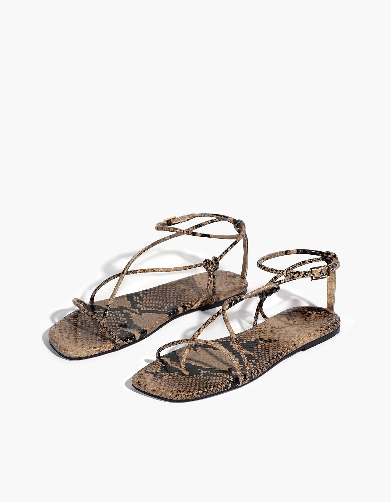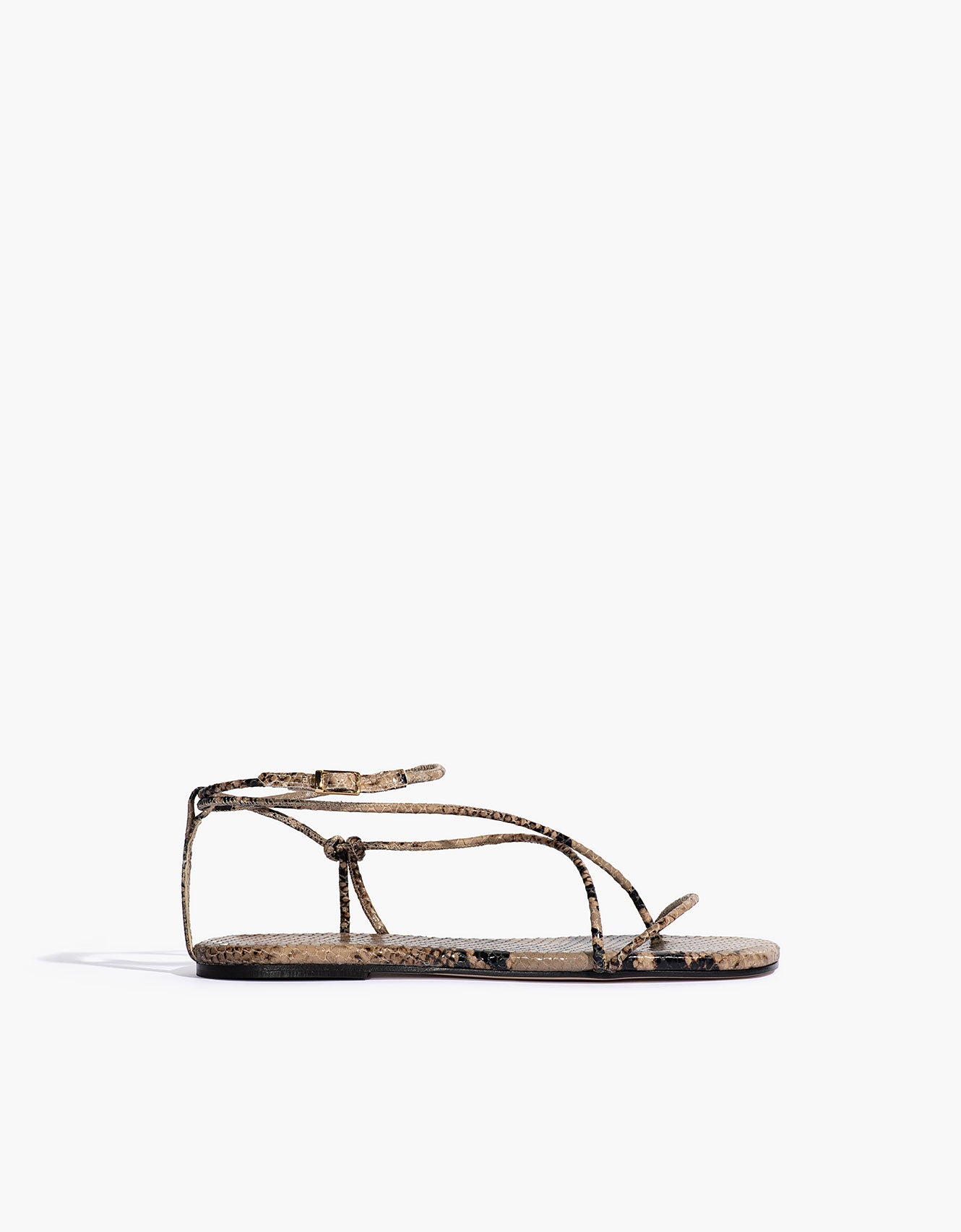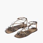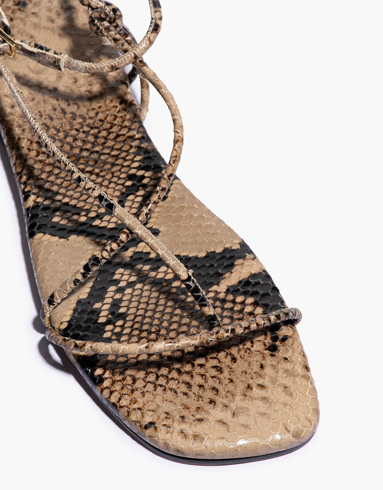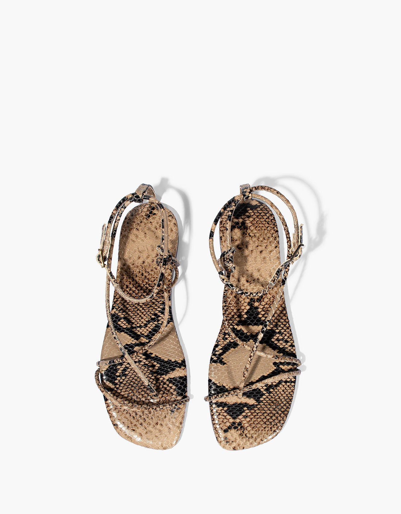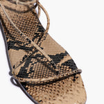 The Lily sandal in Python embossed leather, a barely-there sandal featuring micro knotting and crossover straps. The Lily has a sueded leather sole for the ultimate luxury finish.