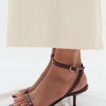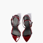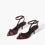 A sleek heel to complete any look this event season. Leona is simple yet sculptural, and features a wrap-around ankle strap, exaggerated pointed toe and a gold micro buckle closure.