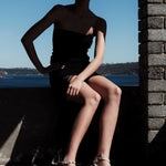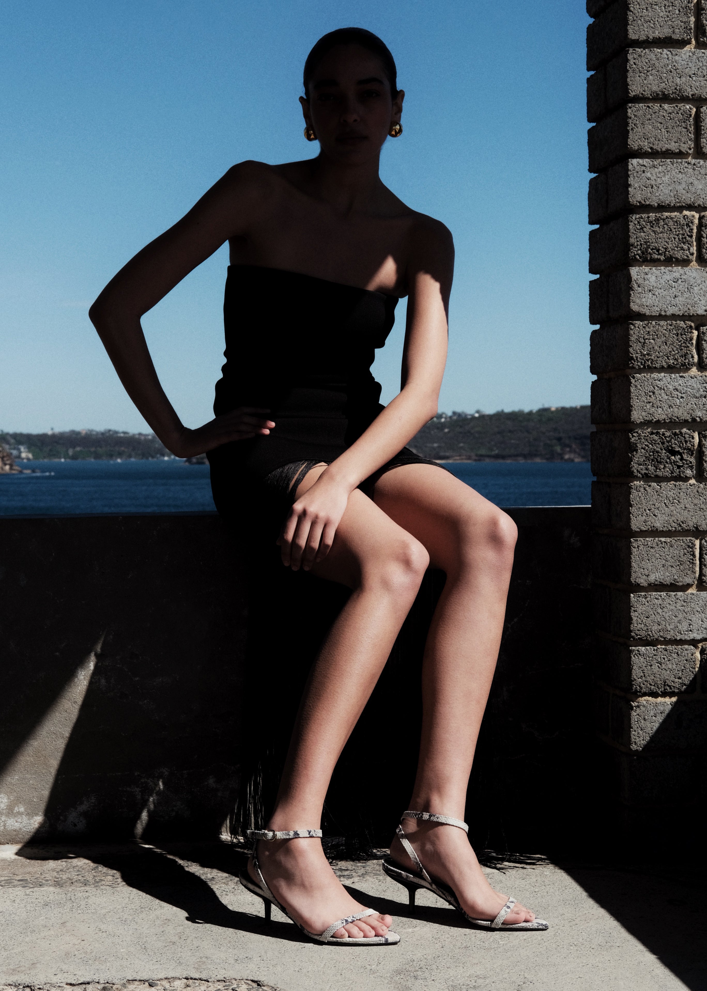 A sleek heel to complete any look this event season. Leona is simple yet sculptural, and features a wrap-around ankle strap, exaggerated pointed toe and a gold micro buckle closure.