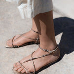 The Lily sandal in Python embossed leather, a barely-there sandal featuring micro knotting and crossover straps. The Lily has a sueded leather sole for the ultimate luxury finish.