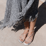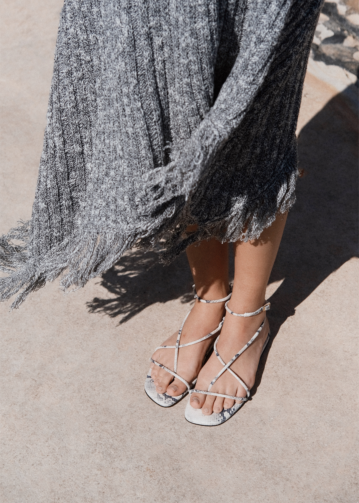 The Lily sandal in Python embossed leather, a barely-there sandal featuring micro knotting and crossover straps. The Lily has a sueded leather sole for the ultimate luxury finish.