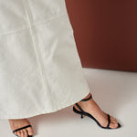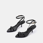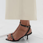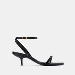 A sleek heel to complete any look this event season. Leona is simple yet sculptural, and features a wrap-around ankle strap, exaggerated pointed toe and a gold micro buckle closure.