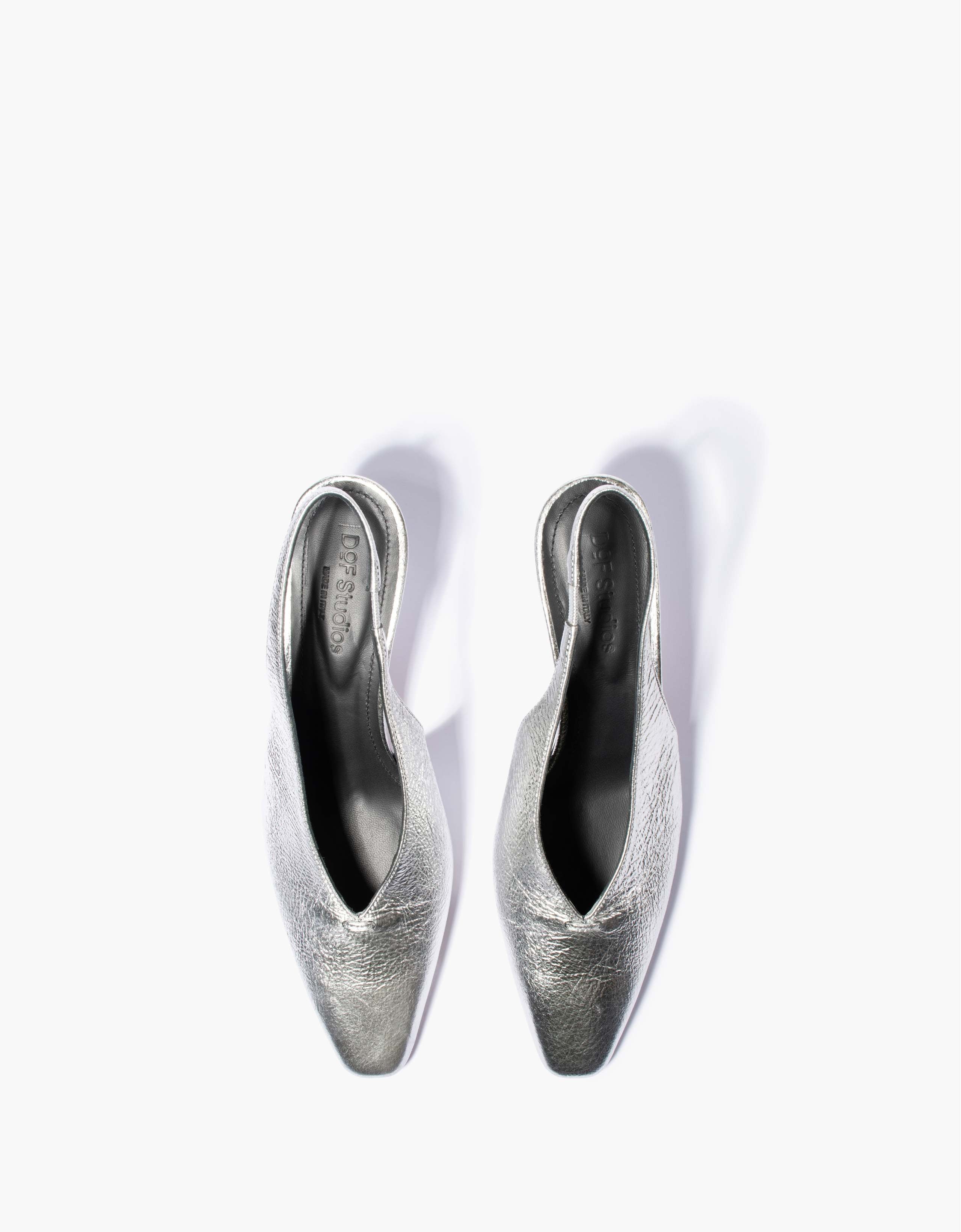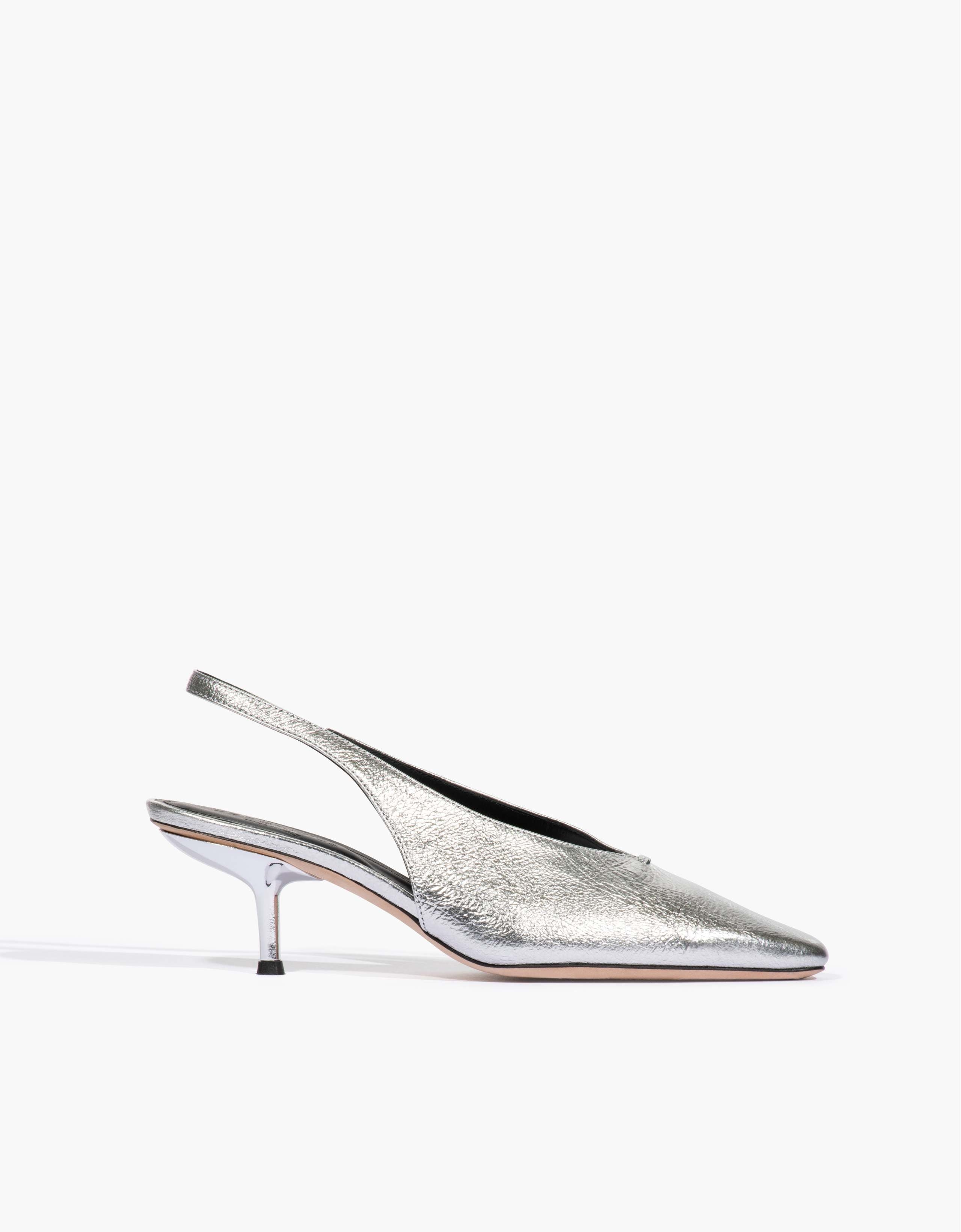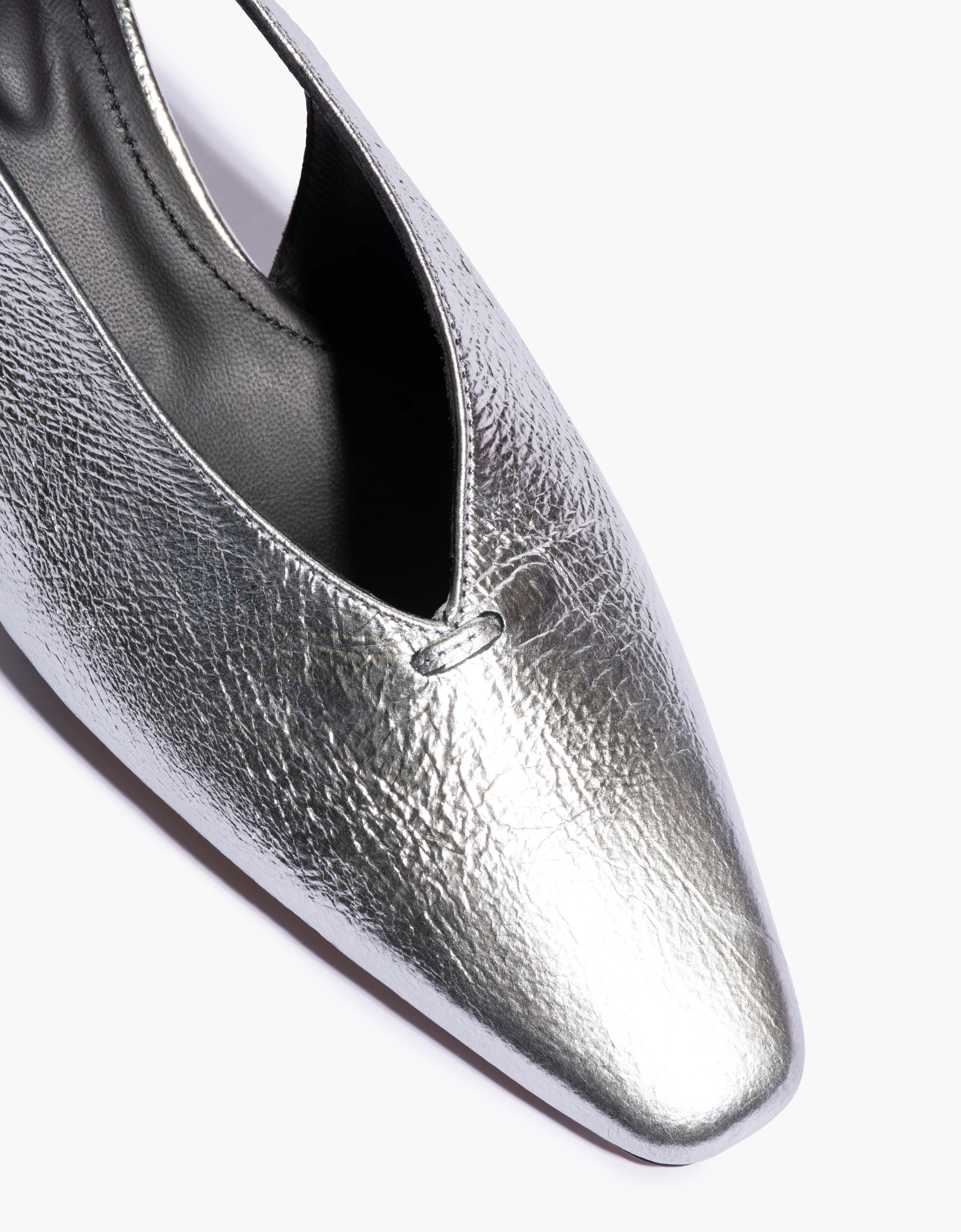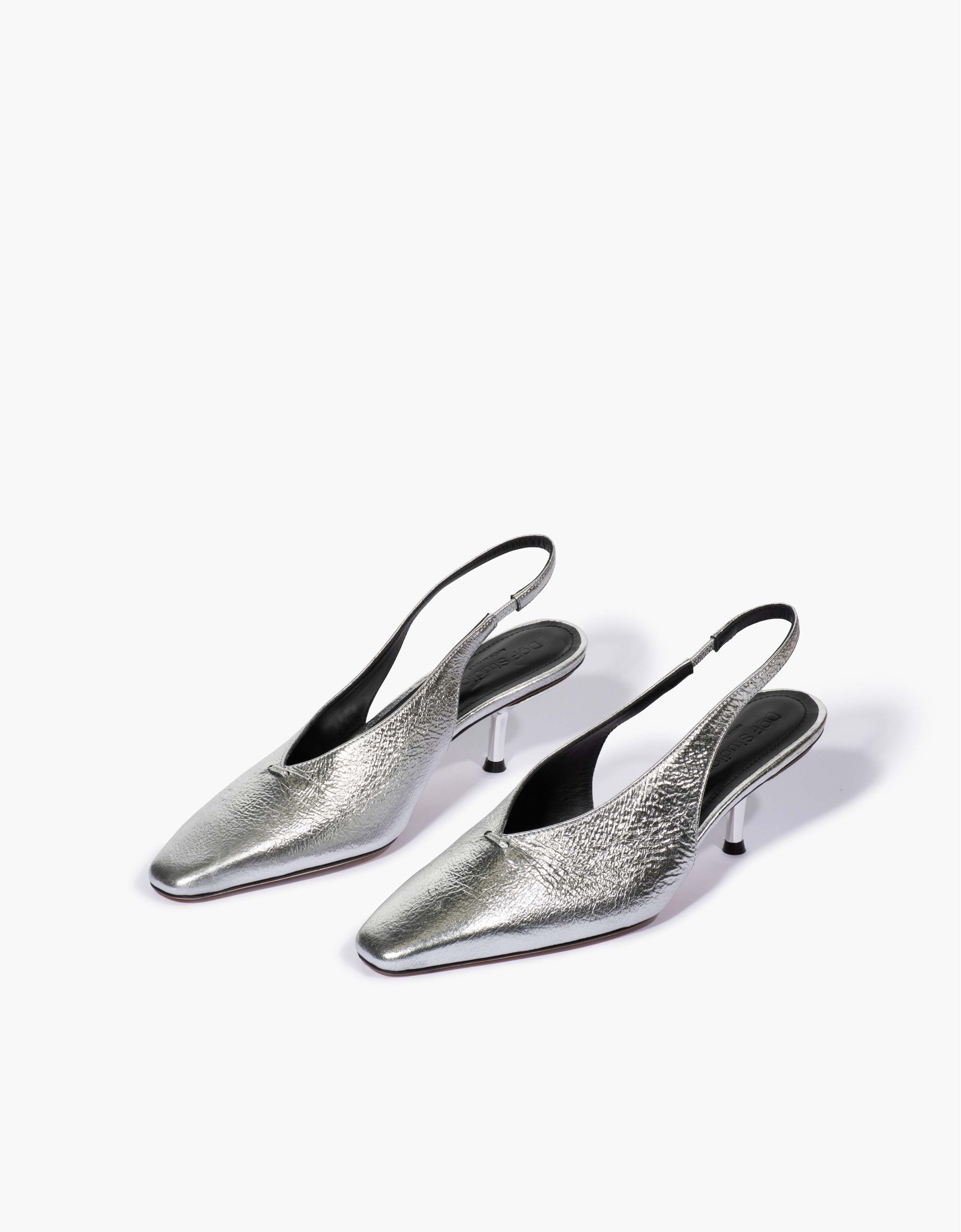 The Lulu Slingback Heel offers a modern take on a timeless silhouette featuring a slingback strap and middle stitch detail. Crafted with a textured silver finish, Lulu is a sophisticated silhouette that perfectly transitions from desk to dinner.