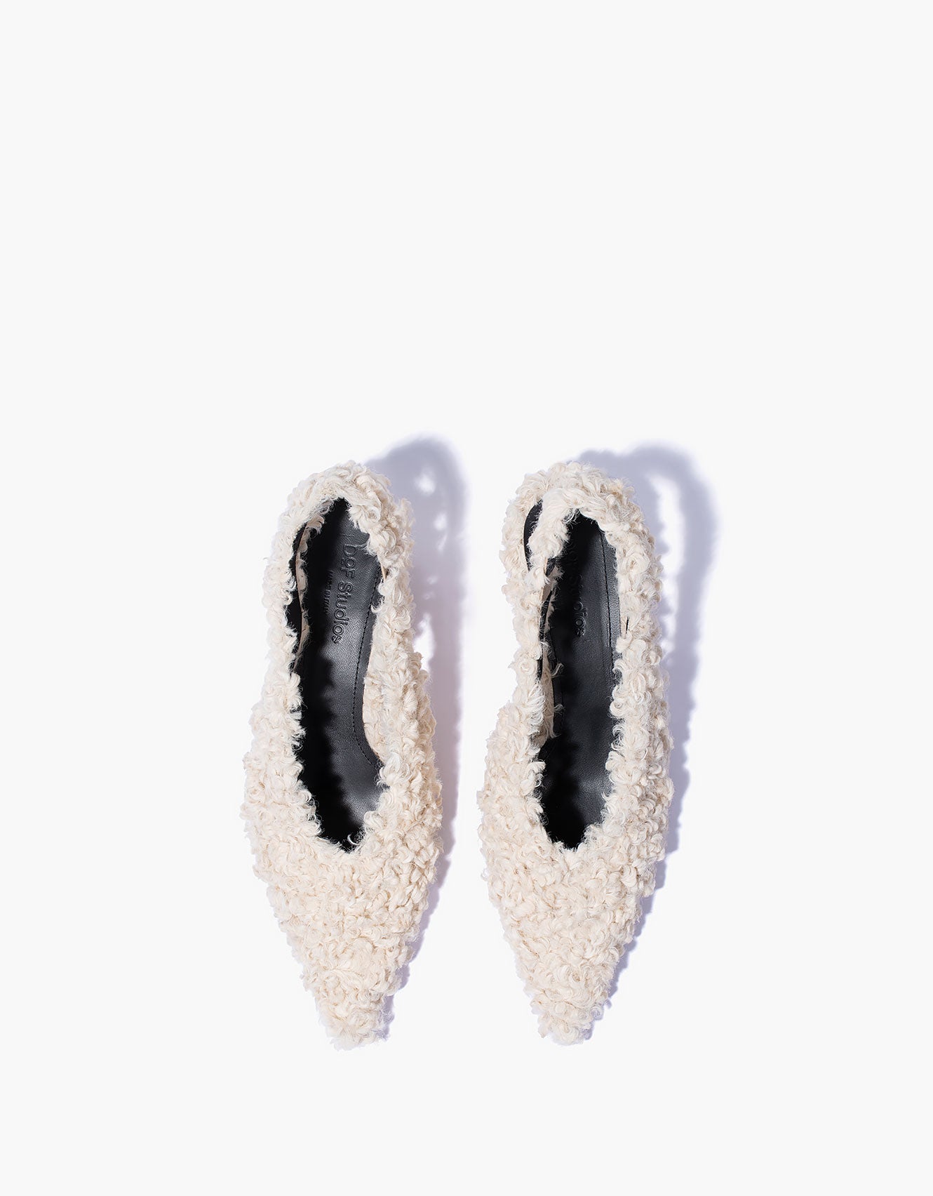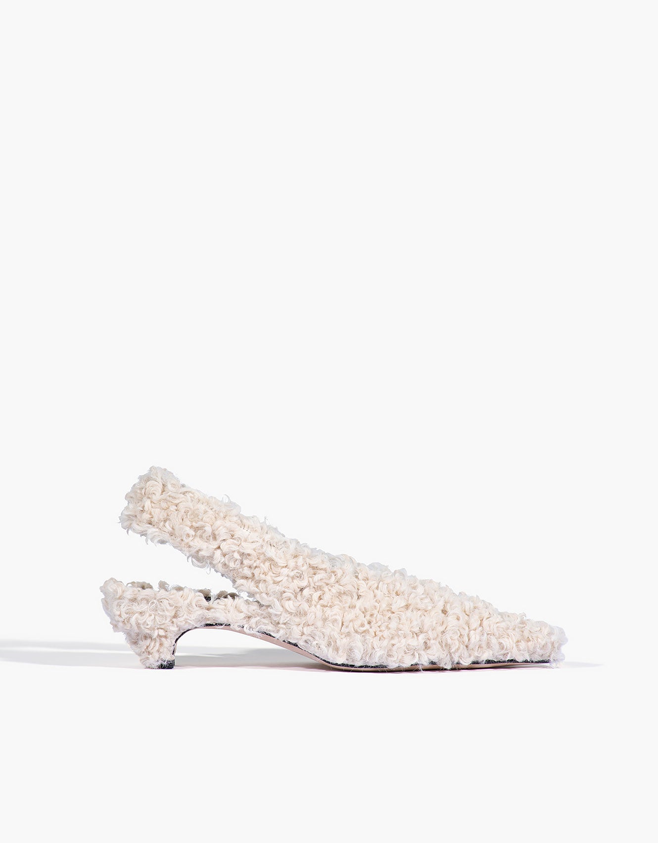The Tory Heels are a modern interpretation of a classic pump, with bold slingback straps and a low heel. Imagined in a cream shearling fabrication, Tory offers a distinctive point of interest to a minimalist outfit, transitioning from day to evening.