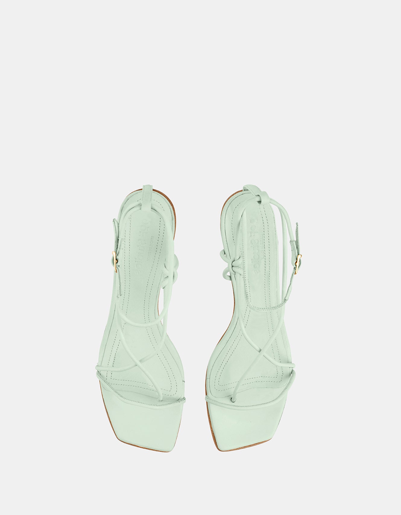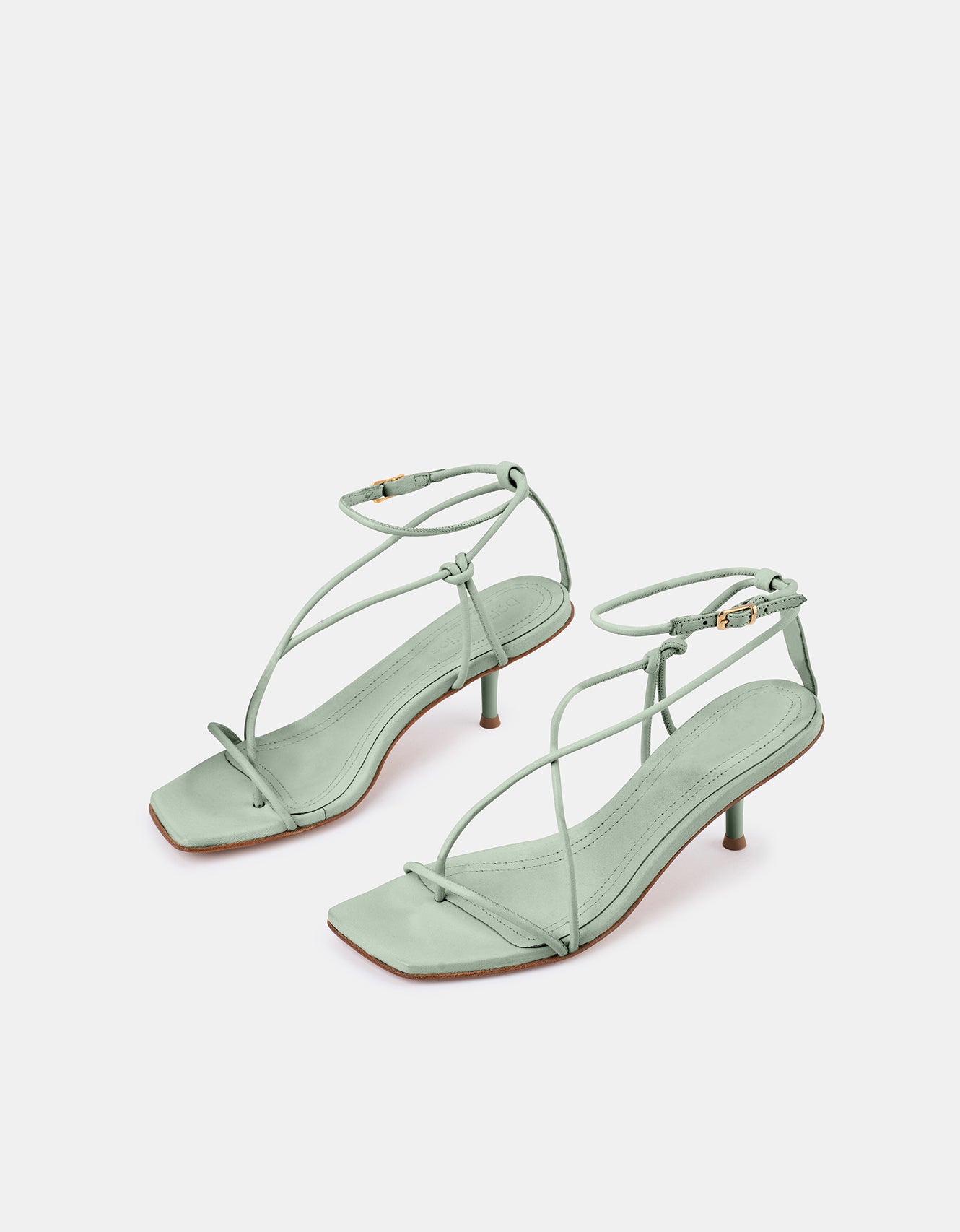 A sculptural mid-heel featuring micro-knot detailing and a mini buckle for fastening.