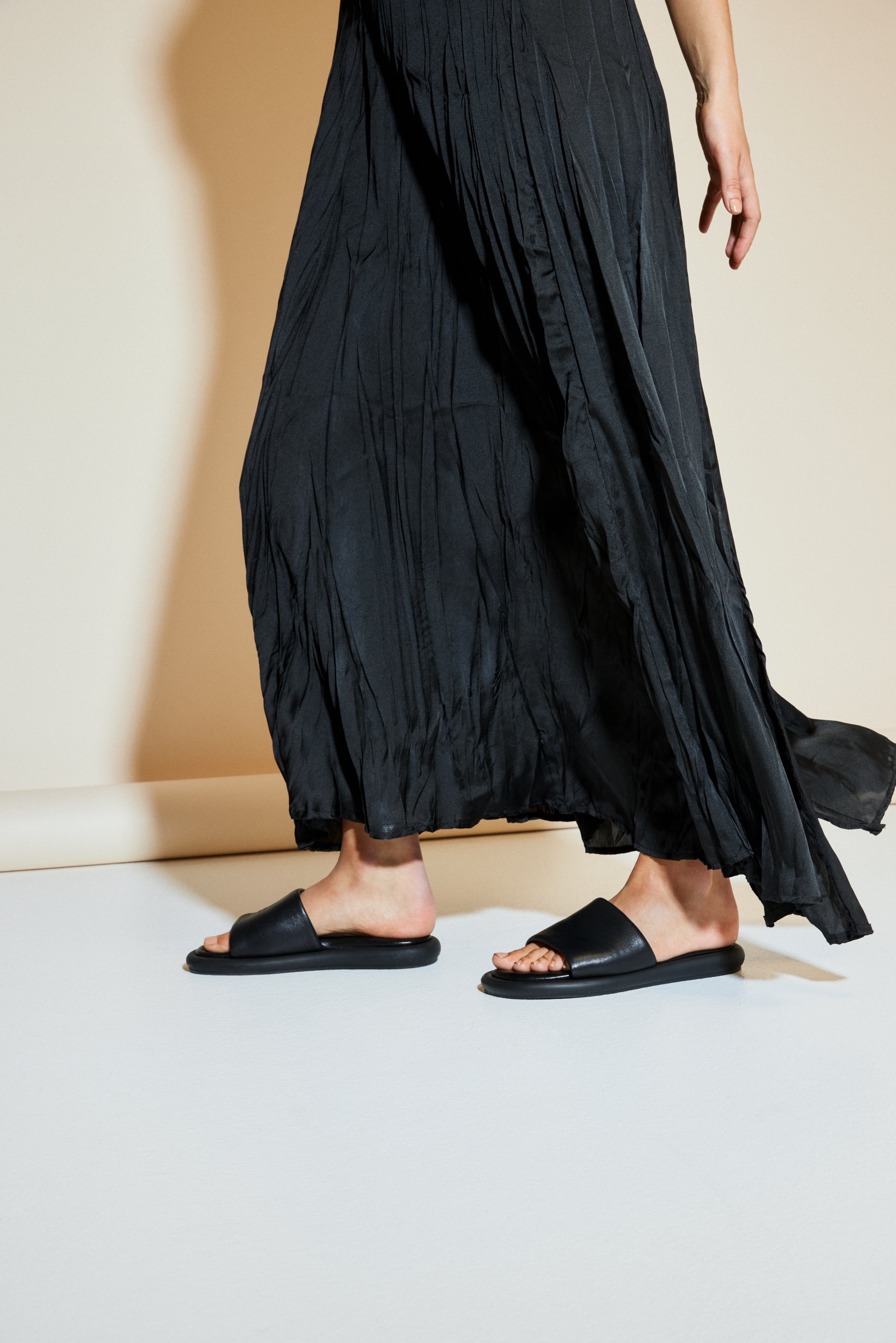 Minimal and ultra-comfortable, the Yasmin Slide features a wide padded leather strap and a soft, moulded footbed for effortless all-day wear.