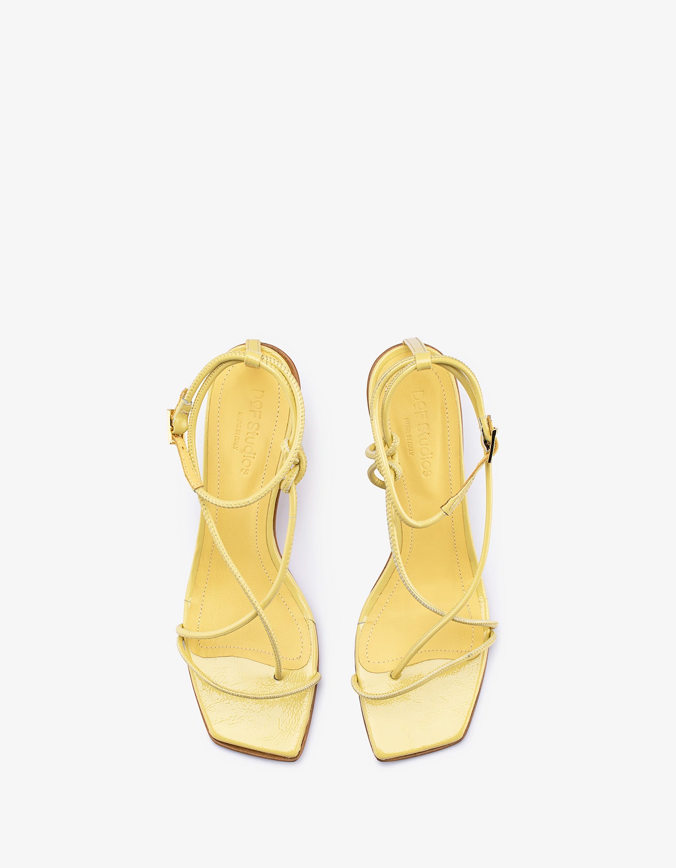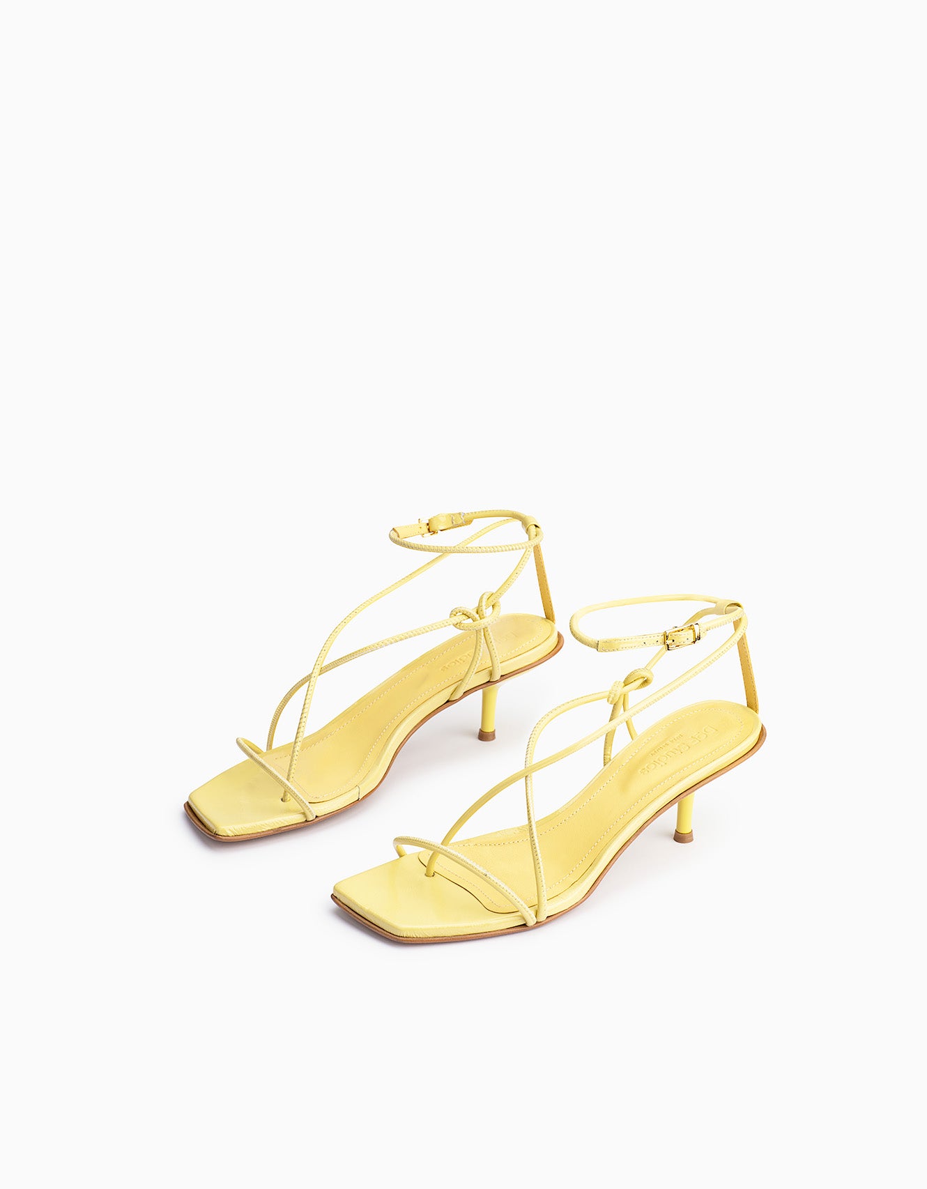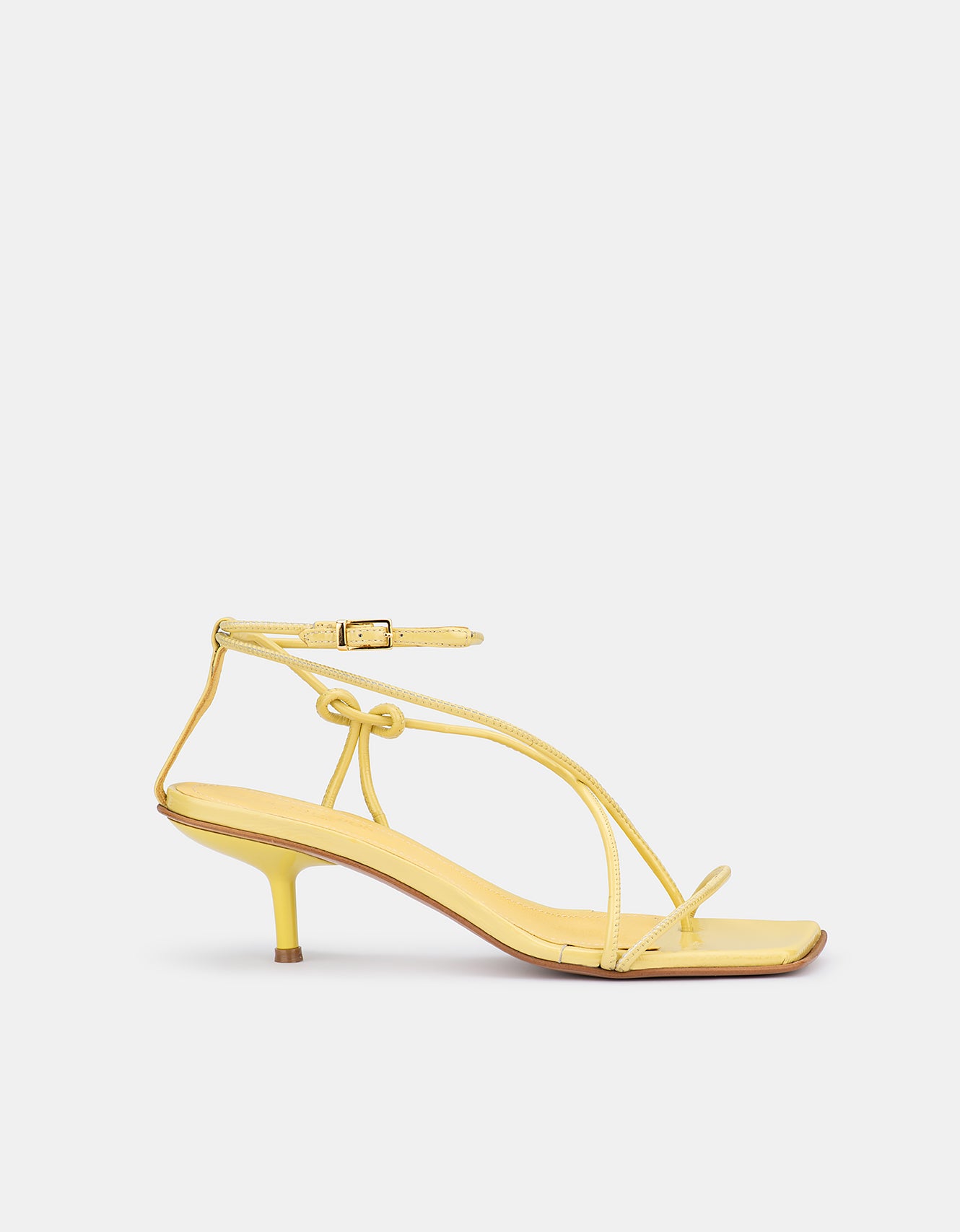 A sculptural mid-heel featuring micro-knot detailing and a mini buckle for fastening. Hand-constructed in Italy from vibrant glossy yellow leather.
