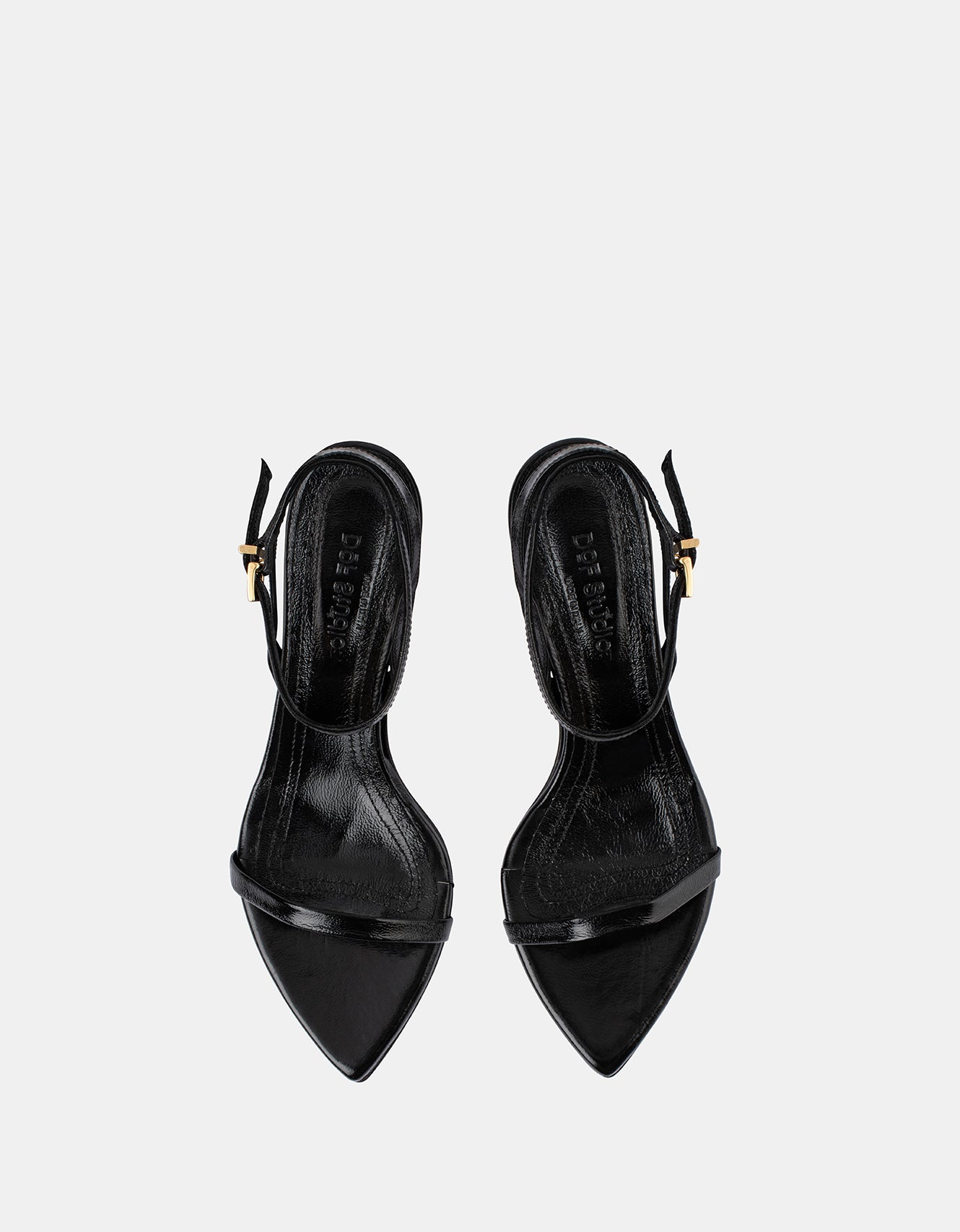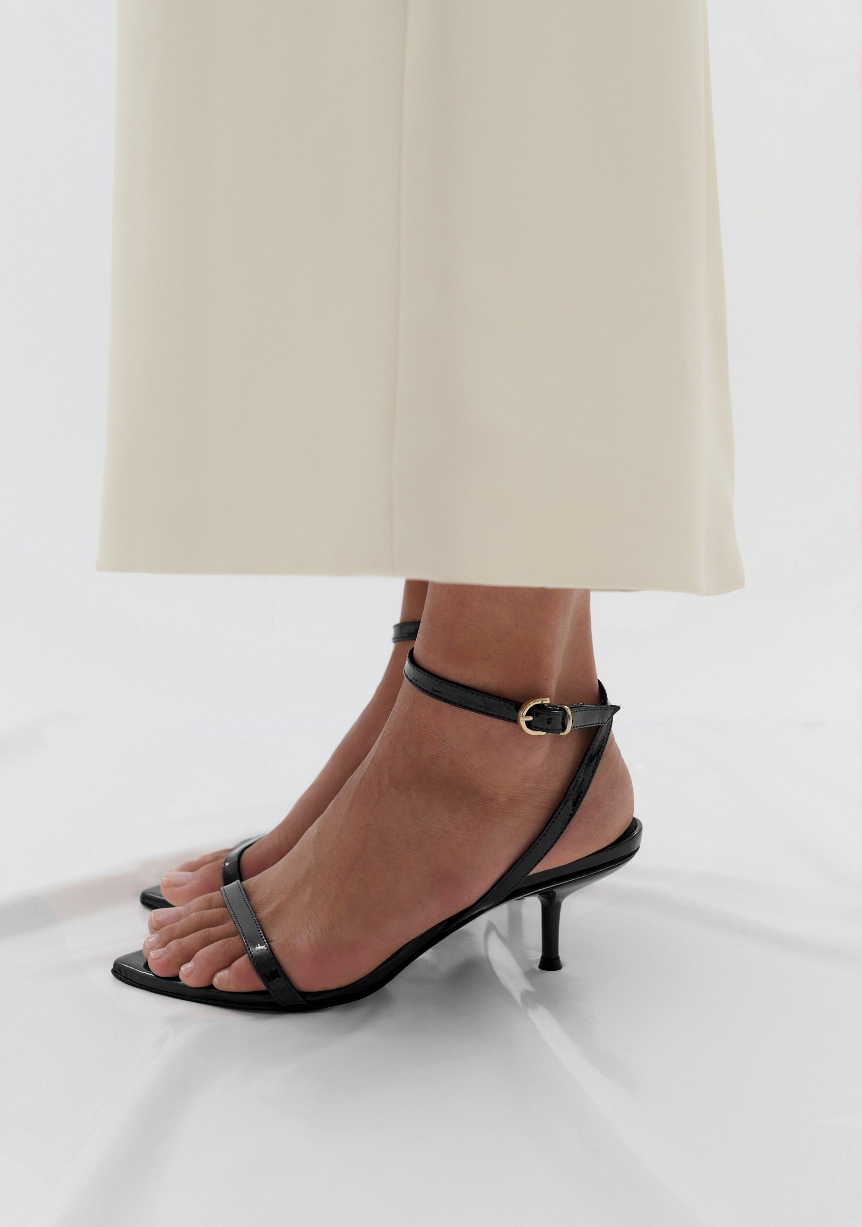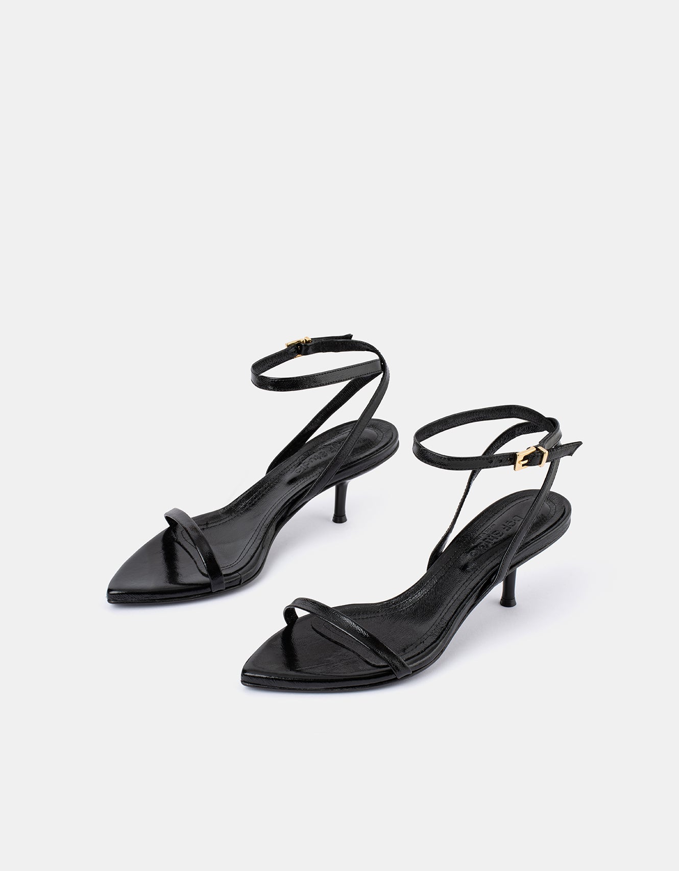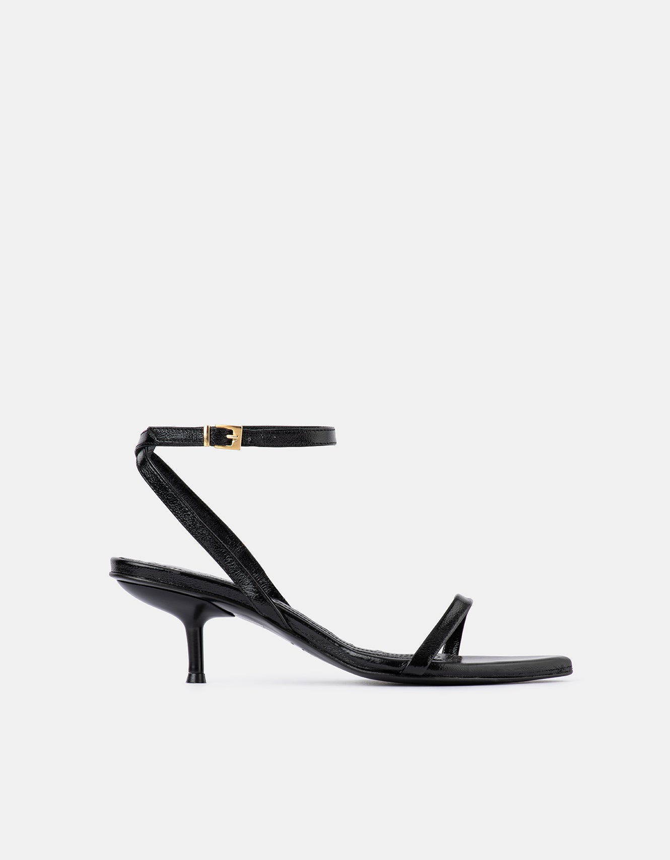 A sleek heel to complete any look this event season. Leona is simple yet sculptural, and features a wrap-around ankle strap, exaggerated pointed toe and a gold micro buckle closure.