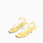 A sculptural mid-heel featuring micro-knot detailing and a mini buckle for fastening. Hand-constructed in Italy from vibrant glossy yellow leather.