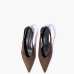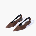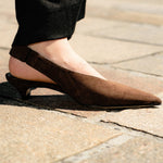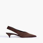 The Tory Heels are a modern interpretation of a classic pump, with bold slingback straps and a low heel. Imagined in chocolate suede fabrication, Tory offers a distinctive point of interest to a minimalist outfit, transitioning from day to evening.