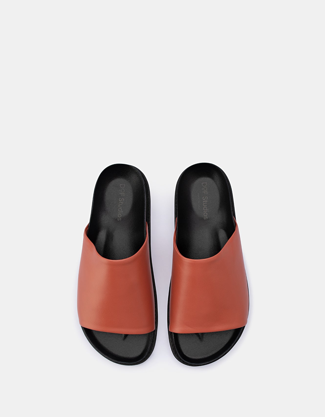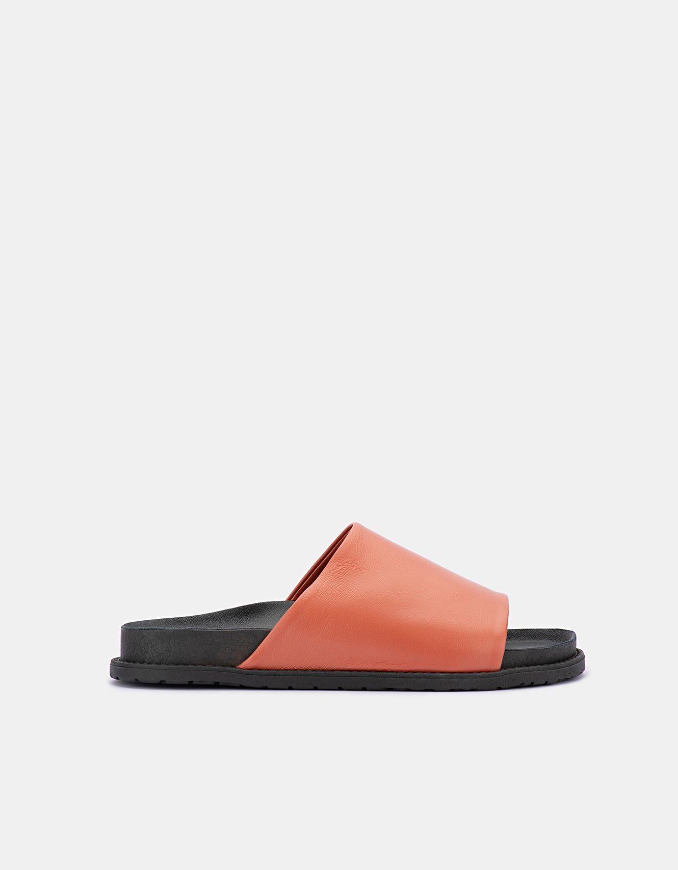 A minimal slide with a full leather lined upper on a moulded sole. This footbed is designed to be firm under the foot to provide great support.