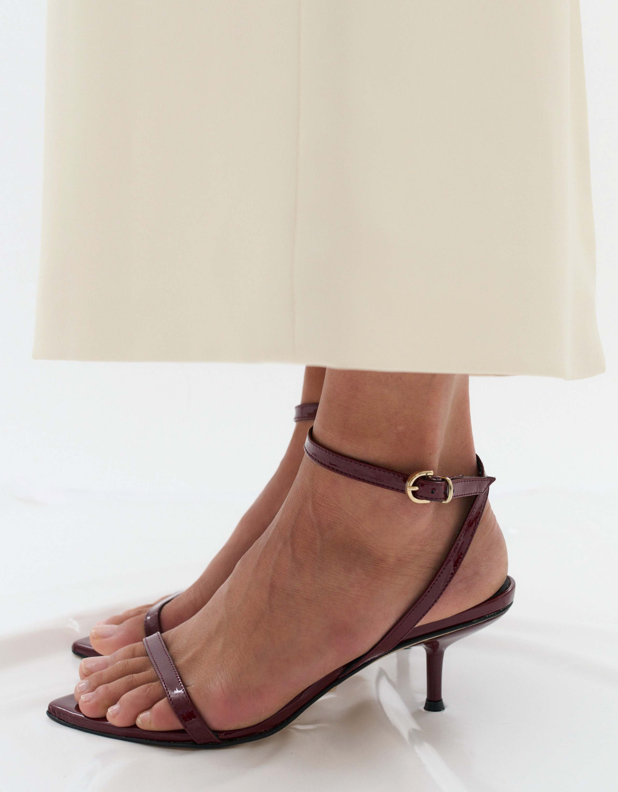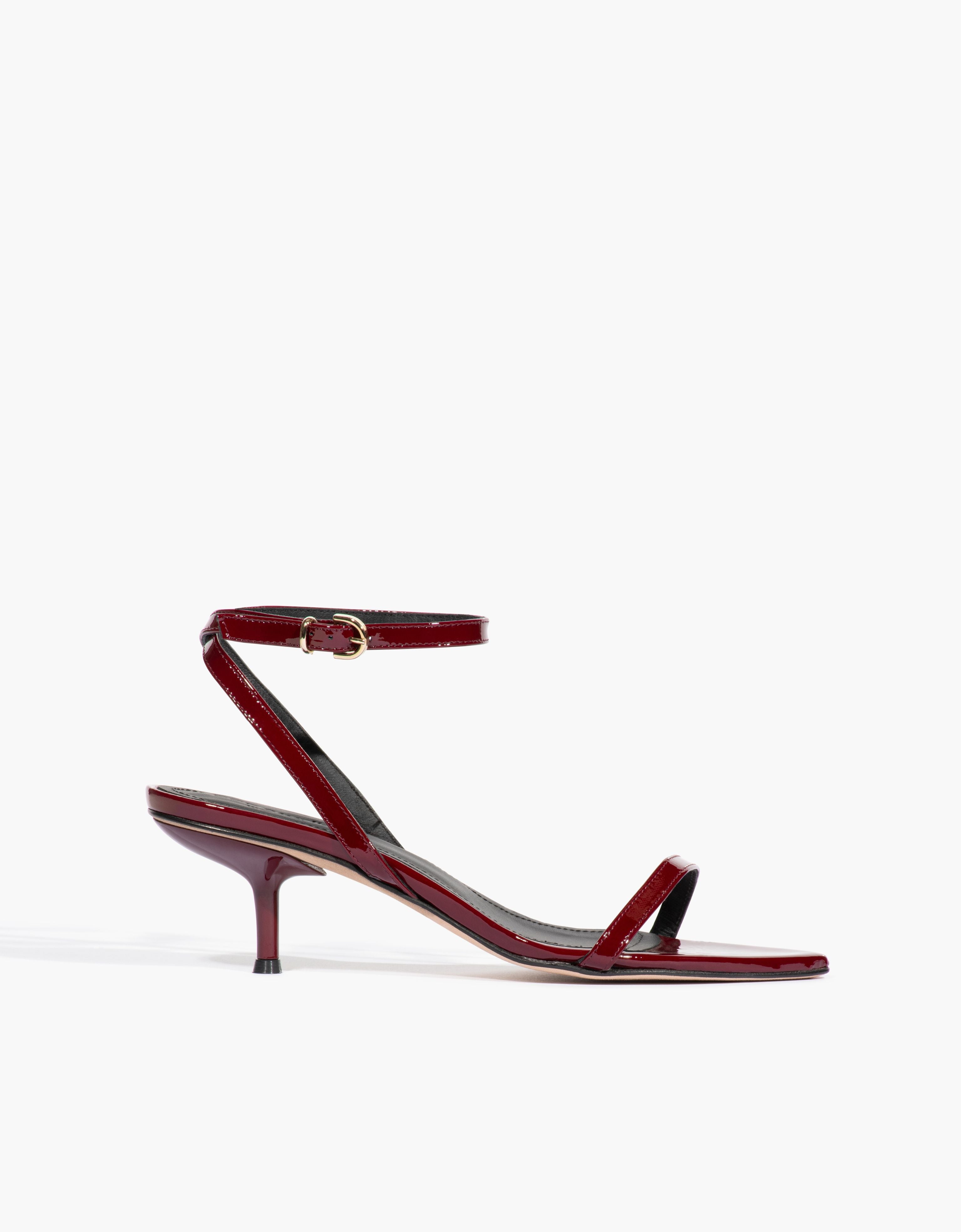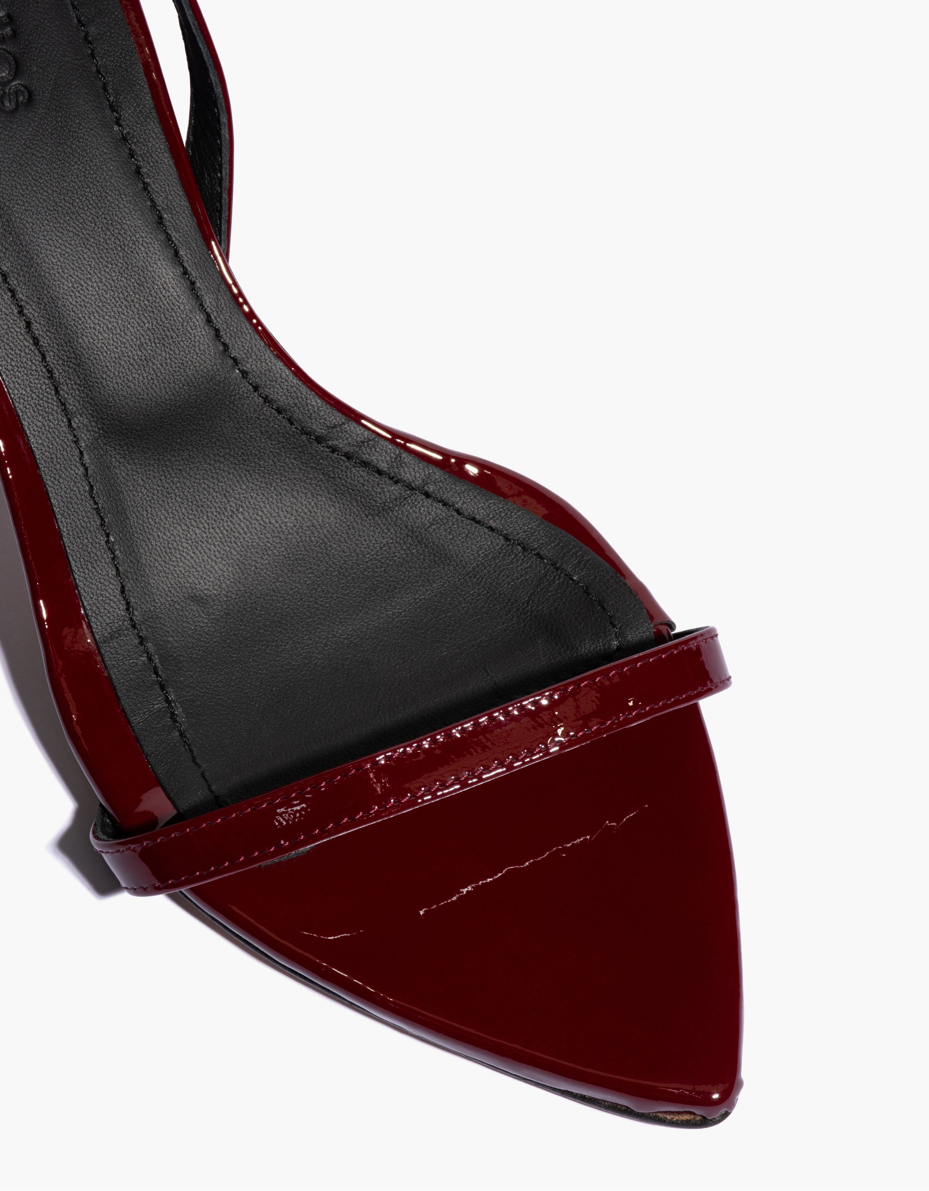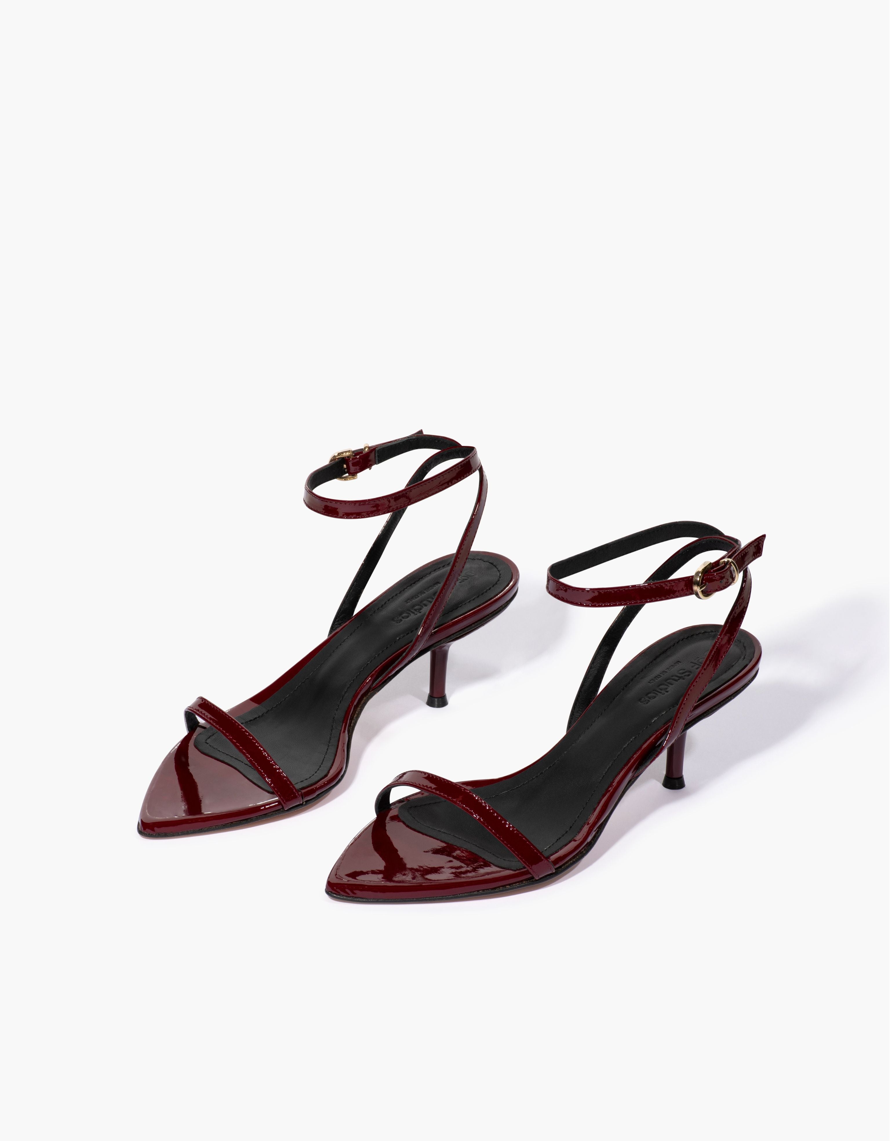 A sleek heel to complete any look this event season. Leona is simple yet sculptural, and features a wrap-around ankle strap, exaggerated pointed toe and a gold micro buckle closure.